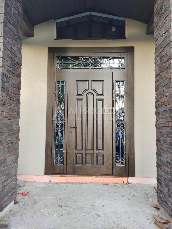 Второй шаг — формат и дизайн. Для современного коттеджа уместно решение с максимально лаконичными линиями: металлическая входная уличная дверь в графитовом оттенке, возможно со стеклянными вставками и горизонтальными фрезеровками. К классическому фасаду лучше подойдёт стальная уличная дверь «под дерево» с панелями МДФ и фигурной филёнкой. Важно, чтобы отделка гармонировала с окнами, кровлей и общим стилем участка.